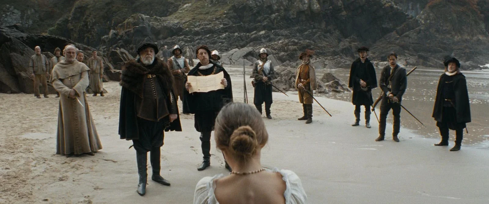 Le scénario, dont les premières séquences sont très rapides, se déleste habilement de certaines questions en suspens pour ne pas encombrer le cœur de son sujet. Dès le départ, nous savons que Marguerite a survécu. L’une des toutes premières images la montre d’ailleurs de retour en France où elle va être jugée pour sorcellerie (ô surprise !), car personne ne peut croire qu’elle ait pu s’en sortir sans l’aide du diable. C’est donc une assemblée d’hommes qui s’apprêtent à la condamner une seconde fois.